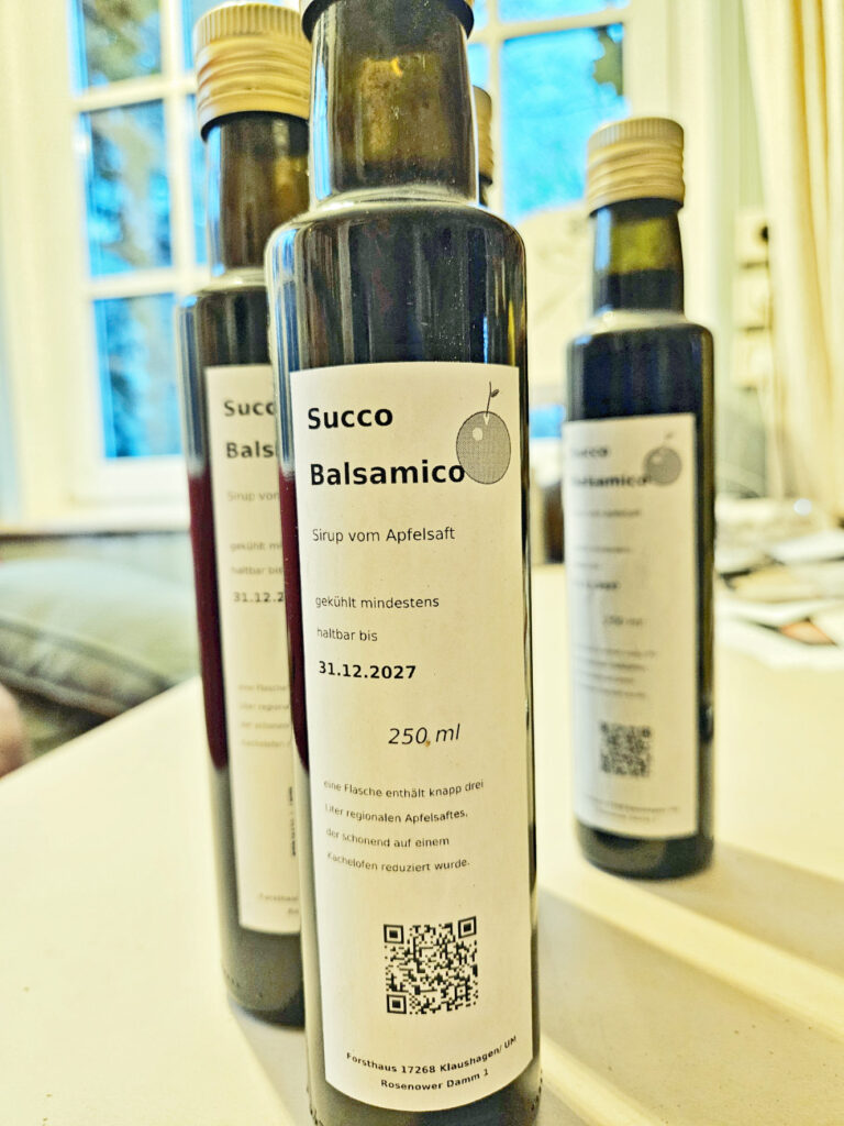 Eingedickte Fruchtsäfte sind keine Erfindung der Bioläden. Im Mittelalter war „Sapa“ — eingekochter Traubenmost — im Mittelmeerraum so verbreitet wie heute Zucker. Plinius der Ältere beschrieb verschiedene Eindickungsgrade, die Römer verwendeten ihn als Süßungsmittel und Konservierungsstoff. Die Tradition zog sich durch die Jahrhunderte: In der jüdischen Küche Osteuropas gab es „Lekvar“ aus Pflaumen, im Rheinland und in Nordrhein-Westfalen entstand das Apfelkraut als hausgemachte Antwort auf teure Importwaren — dunkel, dickflüssig, lange haltbar. Was wir im Ofen machen, ist im Grunde dasselbe — nur mit Äpfeln von unseren eigenen Streuobstwiesen am Rand der Jungfernheide im Boitzenburger Land, im Röhr statt einer Industrieanlage, und ohne den Umweg über den Handel.